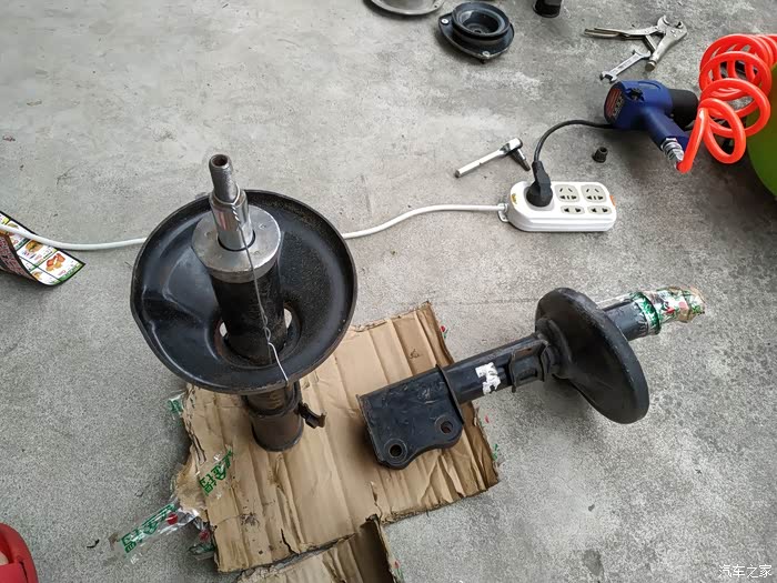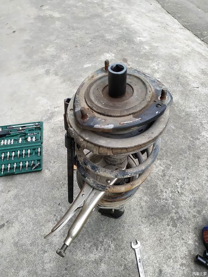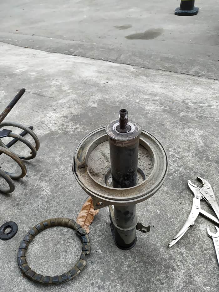 旧减震器,用大力钳夹住芯然后风炮在上面打,好的减震不要这样操作不然会把芯夹坏