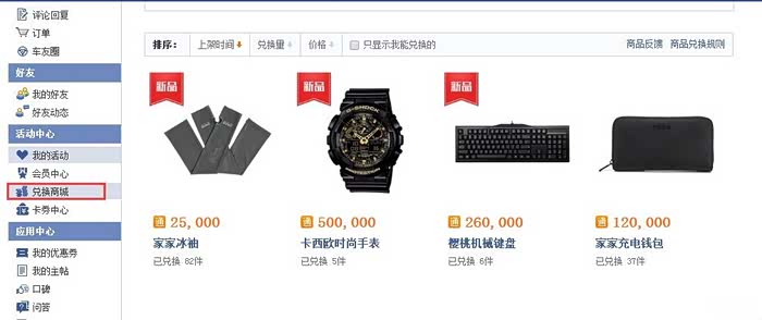 在个人主页左侧活动中心下方便有兑换商城链接,进入后便可以选择自己想要的礼品,当然前提是你有相应的积分可以兑换