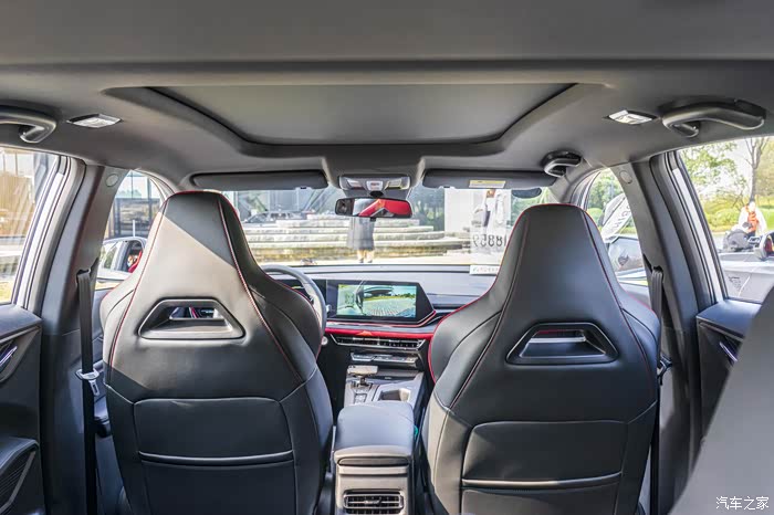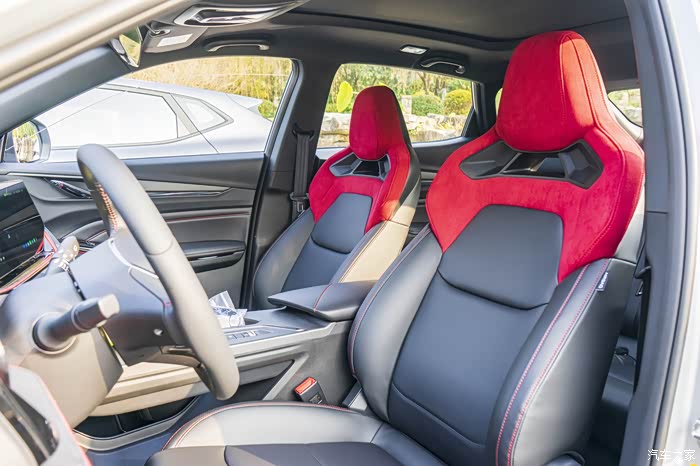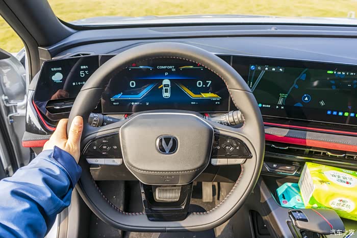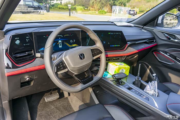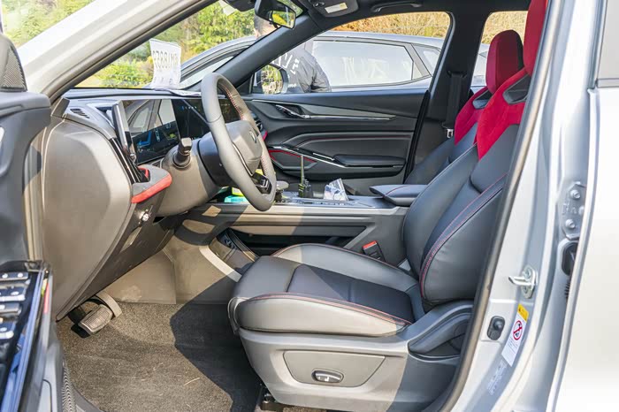 进入车内,全液晶仪表盘与中控屏,以及最左侧的一块信息屏幕,组成的三联屏设计让人眼前一亮,向驾驶员一侧倾斜的中控屏操作起来非常方便。平底的三辐式多功能方向盘和个性十足的换挡杆,都让驾驶体验更加出色。贯穿式的空调出风口则保证了车内空气的流通性。内饰的质感做得非常到位,无论是用料还是细节处理都展现出高品质的工艺水平,不会显得廉价。