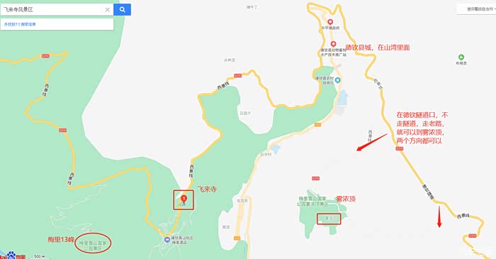 观景机位,推荐飞来寺或者是雾浓顶,日照金山只有那么短暂的半个多小时,当天只能2选1,这两个地方地图上我标记出来,在下图中,看着不远,实际还是要半个小时车程的。