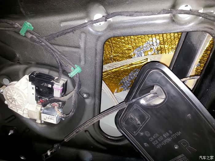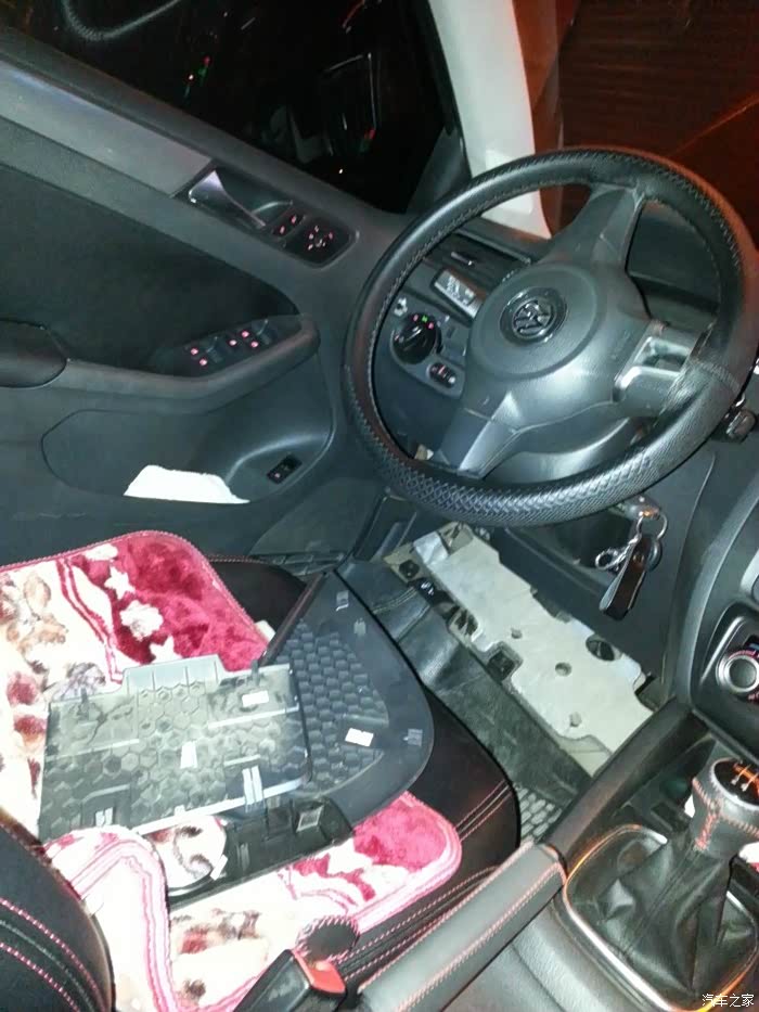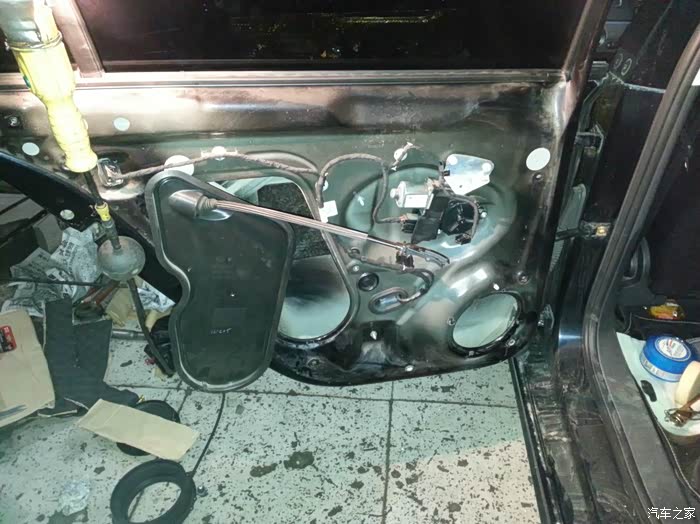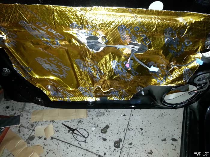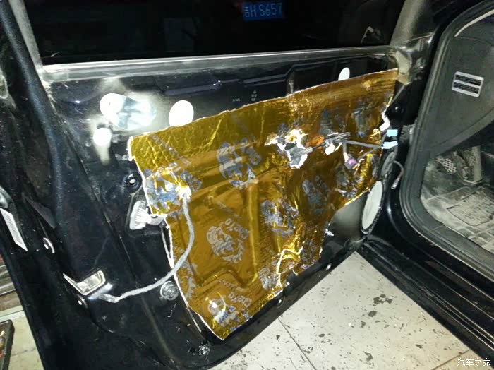 继续折腾,我开车喜欢听音乐,但是速腾的音响让我真的。。无话可说了!因为银子不足,所以自己在网上做做功课,某宝采购,自己DIY。。找了一个朋友的修车行,利用晚上和我叔两人做四门三层隔音,隔音材料很容易给手弄坏。。想自己弄的朋友一定要带手套