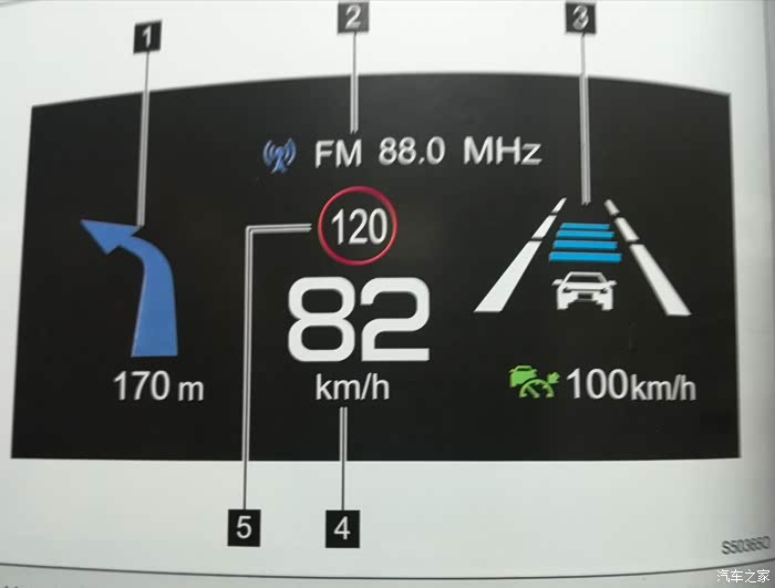 上面是HUD可显示的内容。但我驾驶过程中,只看到过显示车速(4)及导航箭头(1)。收音机开启时,并不显示频率(2),但在切换收音频率时,有一闪而过的显示,最多一秒就熄灭了。限速提示(5)同样没看到。巡航开启后,其标记在多功能屏上能看到,在HUD上到没有(3)。