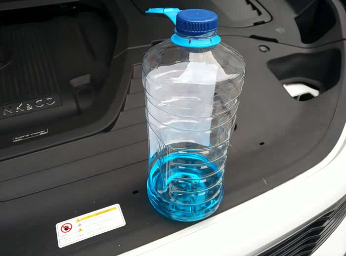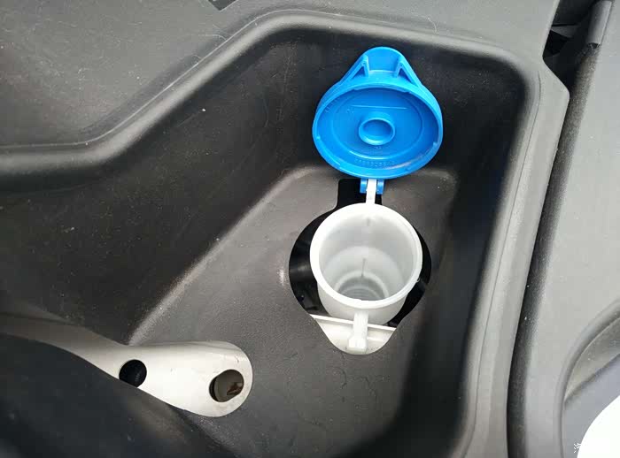 副驾位车头前角处就是玻璃洗涤液加注口...兰色的盖子对应洗涤液的颜色,盖子上前挡+喷水标志一目了然...