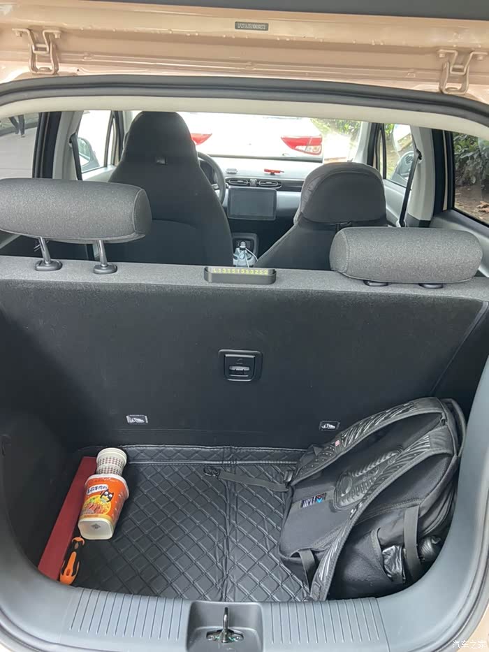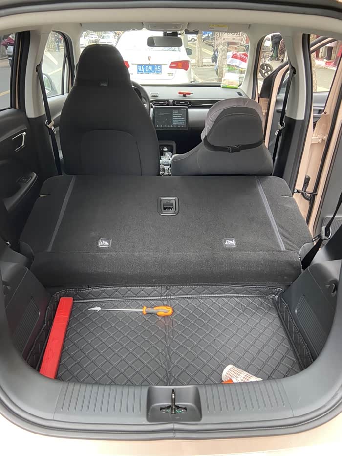 6. 空间部分:空间我是比较满意的,因为我当时买车就是为了好停车,这么小的车身,反倒给我觉得空间有额外惊喜,驾驶舱还有乘坐的位置,给的空间都比较宽裕,所以导致后备箱的空间比较小,如果行李不多,那么经常载人的话还是非常实用的。如果要拉货的话,可能需要把后座放倒。后备箱可以放一个20寸的行李箱。因为深度比较深,实际能放的东西还是比较多的,我的露营装备基本上都能放进去。如果需要应急,可以把后排放倒,这样的话大概能有一个500升左右的空间,基本上拉货也是够的。