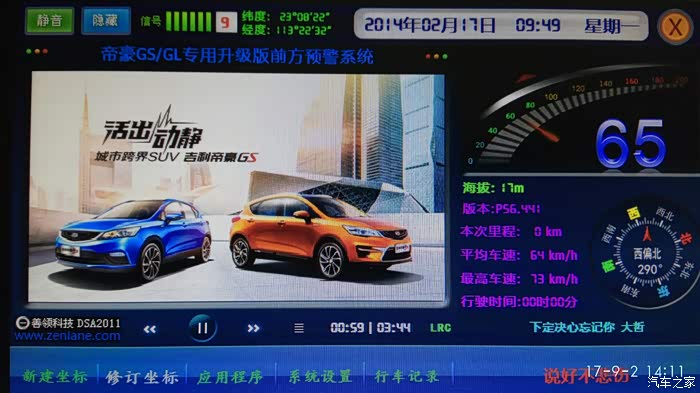 这里说明一下:A:DSA+凯立德组合版 运行时声音都不能通过方向盘上面的方控按键和音量旋钮控制音量大小,只能通过界面控制,DSA音量只能开启或静音,无法调节大小,固定的,开起后音量适中,不大不小,刚合适。凯立德可以通过界面控制音量大小,后期上传的数据包已调试好,DSA预警系统和凯立德导航音量一致,音量适中,DSA负责前方预警,凯立德负责导航,如果熟悉路的话只允行DSA预警系统即可。