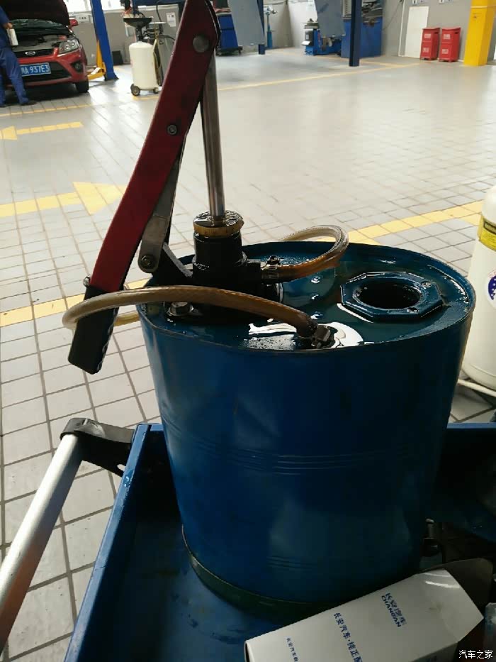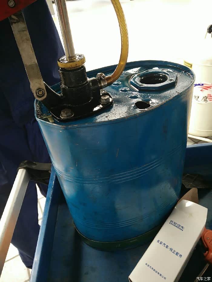由于是两桶油。现在是加完了第一桶,师傅拿第二桶油去了