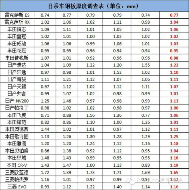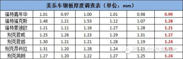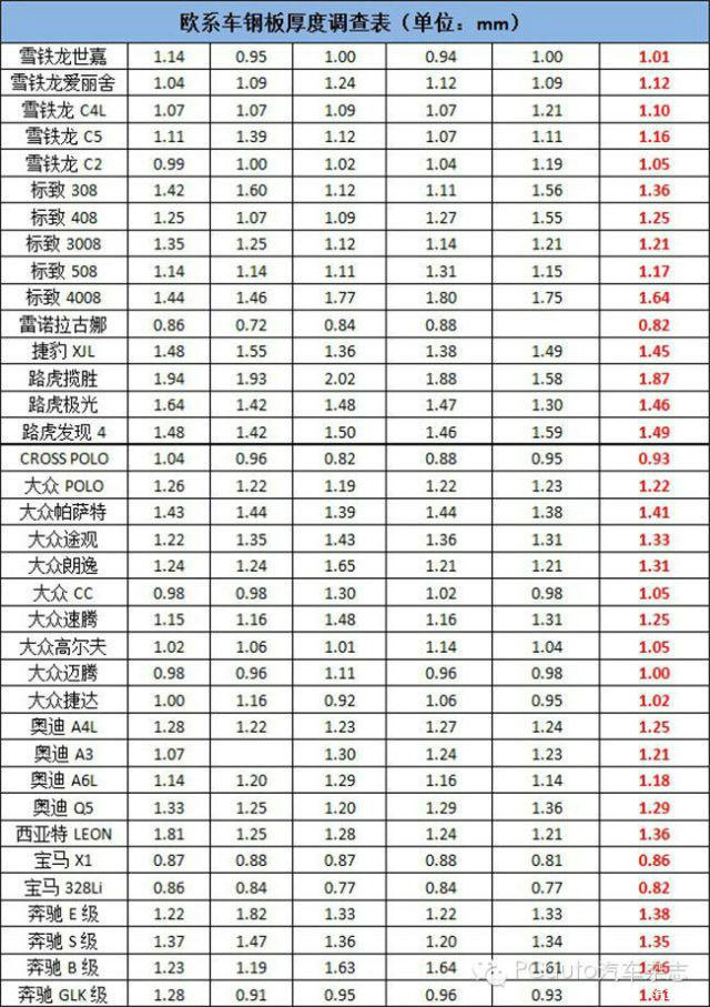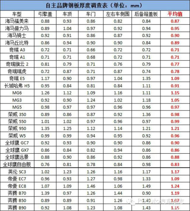 检测流程介绍车身覆盖件厚度检测(即钢板厚度检测)过程中把被测车型分为五大部分,分别是引擎盖、车顶、前后车门、左右车侧围以及后备箱盖板。为了测试的准确性,每一部分又随机选取三个测试点,通过计算三个被测点的平均值得出该部分钢板厚度的数据。最后取五个部分钢板厚度的平均数据,作为该款车型钢板厚度的平均参考值。检测结果此次调查涉及自主、欧系(包括英、法、德等)、日系、美系车共26个品牌、95款车型。根据有关规定,车身外部件用于顶盖、车门、翼子板、行李箱盖、发动机盖等地方的钢板,一般厚度允许从0.8-2.0mm。所有车型的测试结果如下。
