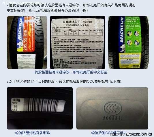 二.轮胎胎面中文标签上所描述的轮胎名称、轮胎规格、载重指数和速度级别与轮胎胎侧所模压的不一致的(请谨记:如果发现标签被故意涂改或破坏的需要格外注意,应避免购买此轮胎)。