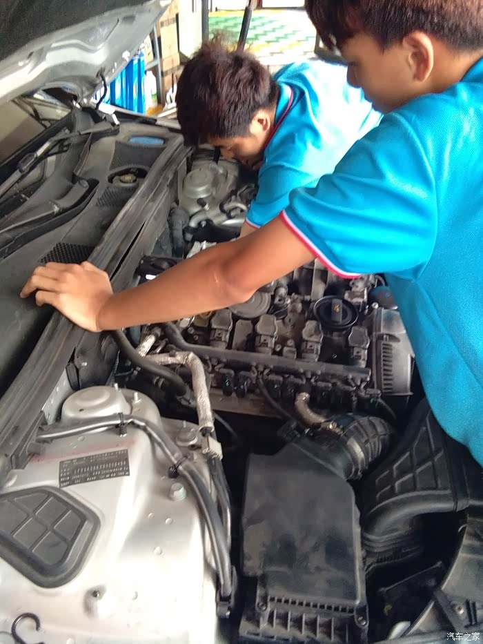 正在拆变速箱滤芯,这个滤芯的位置比较别扭,不太好拆,辛苦小师傅了