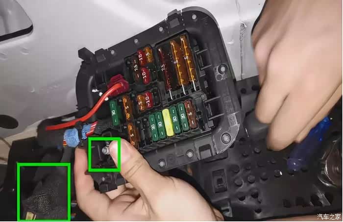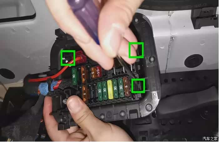 15.标记位置各有一个卡销固定保险盒,用小一字起子挑开即可