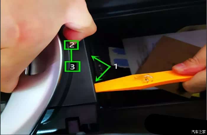 2.标注1位置如有间隙,用撬板向上沿间隙边缘处撬出。待撬到一定程度需要把标注2和3位置的活动挂钩往里面按紧。