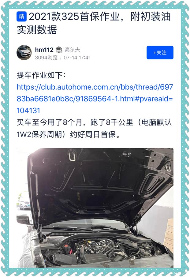 ,车辆初装油目前已经检测过两款了,分别是十代雅阁混动和卡罗拉双擎,其中雅阁混动的还做了元素分析。关于初装油是啥就不再赘述了,有兴趣的朋友可以论坛直接搜索关键字“机油送检 初装油”查看。这次检测的还是一款初装油,来自2021款宝马325 2.0T,国六B排放,从20年11月提车到次年7月首保,一共8个月8000公里,一起看一下他的基础指标是什么样的。