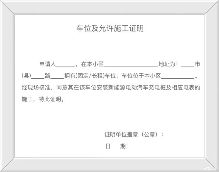 第一步,准备施工证明。前往小区物业填《车位及允许施工证明》并盖章,表格也可通过网上国网APP下载模板,自建房可找居委会或者村组织盖章。