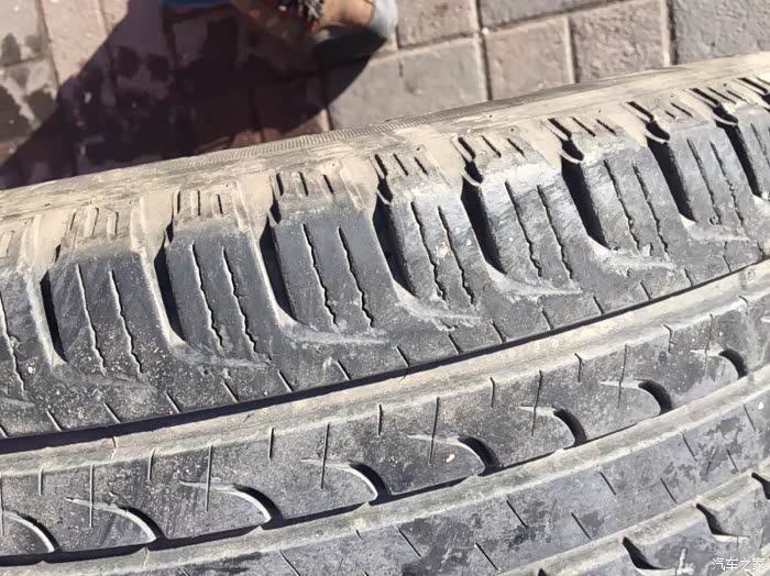 我换下来的原车固特异驭乘和新的建大AT之间的对比。对比还是很强烈的吧!