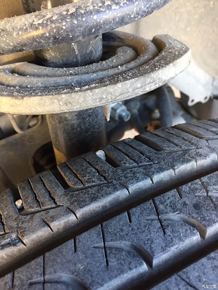 原车胎和新车胎相比,扁平比究竟有多大差距呢,请看这是左前轮原车胎,请注意轮胎卡住的小石头上面那个硬的橡胶凸起,我个人理解那是一个定位的参照物。