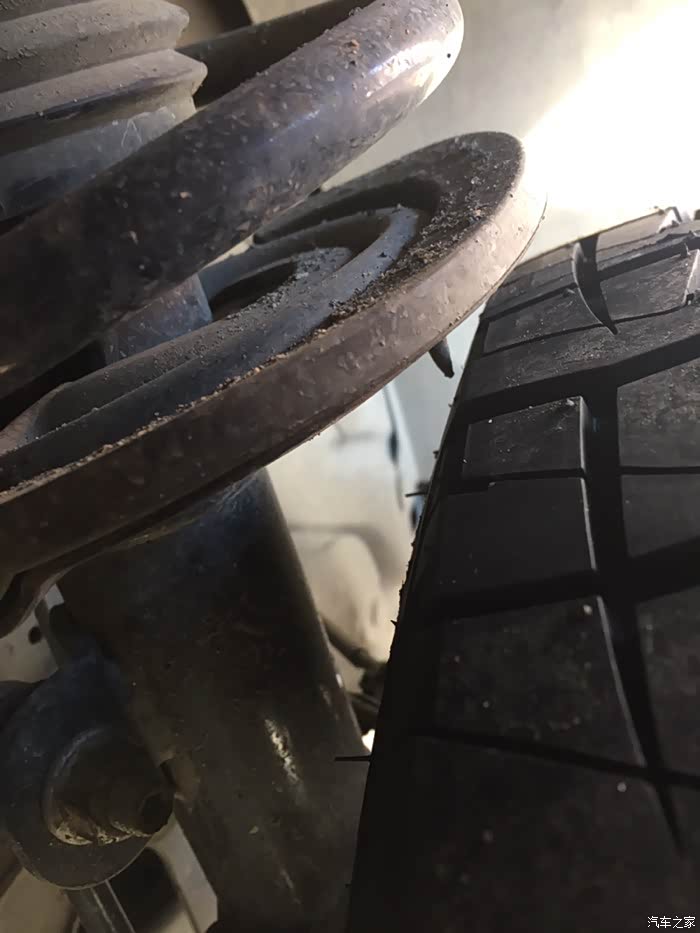 再看右前轮换完轮胎之后那个橡胶凸起的位置,相差了有一个多厘米,这个差距就是5%的扁平比变更的高度差距,也就是说在新胎情况下,离地间隙又提高了一个厘米左右。当然这个距离是会随着胎纹的磨损逐渐减少的。