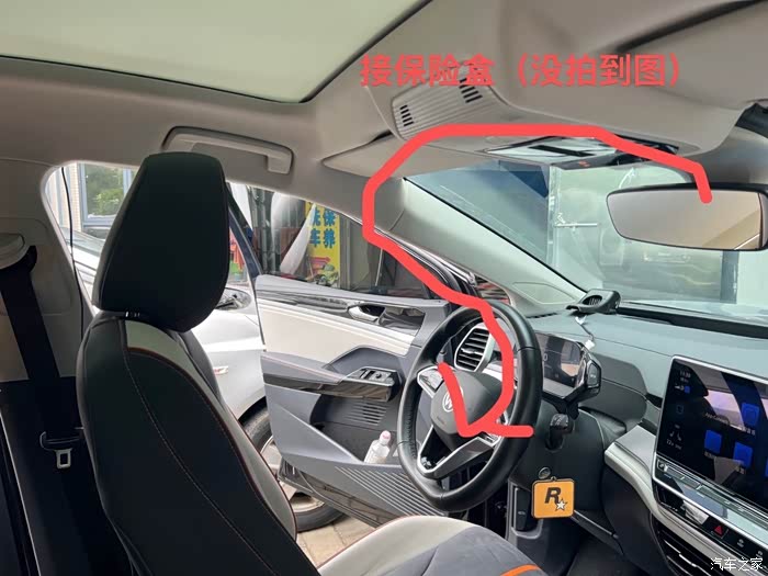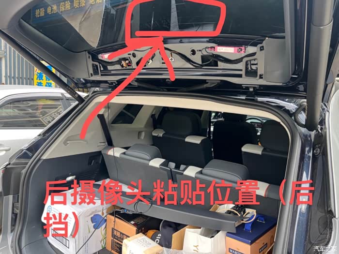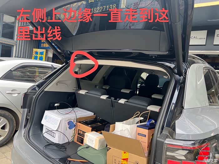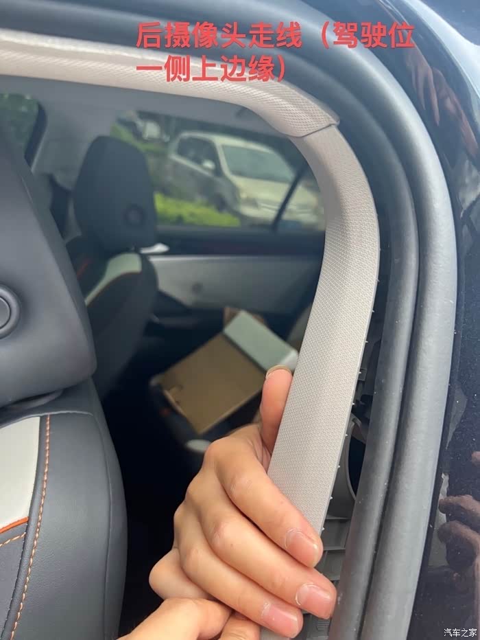 另一个走线,是走后摄像头,路径是从左侧两个车门上沿的内饰面板里面走,需要简易的拆开面板,再把线塞进去走线。
