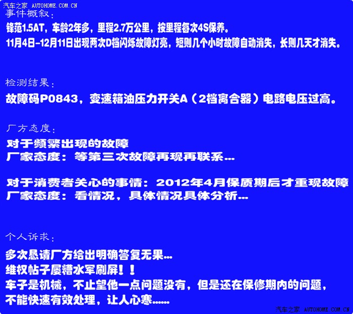 作业到此希望了结,跟车无关,跟服务有关,版主如能射精,十分感谢,给大家以后出现同样问题一个参考,真不敢想过了保才出现故障,厂家跟4S是什么样的嘴脸?!值得车友深思!祝热心网友、车友、F友新年发大财!来年换好车!