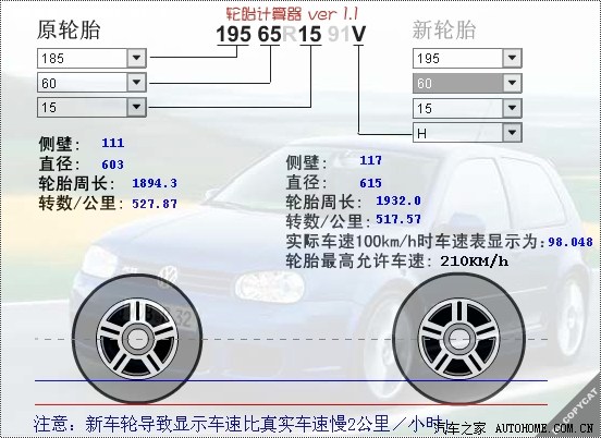 之前,有同学发过一个计算器。这里抓了几张图,可以供有意向更换195胎的同学参考。