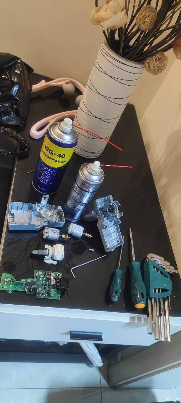拆开后就这个熊样,电机是网购25块钱买来的,顺便用电子清洗剂清洗了一下主板,W40是松螺丝用的,尤其是一开始拆前面那两颗大螺丝特别管用,能减少不少时间,不要喷太多,一滴就够了。