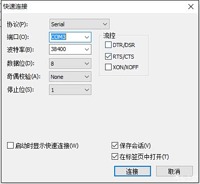 打开SecureCRT软件点快速连接,选择ttl对应的串口号,我这里是com3,点连接不要做别的操作。
