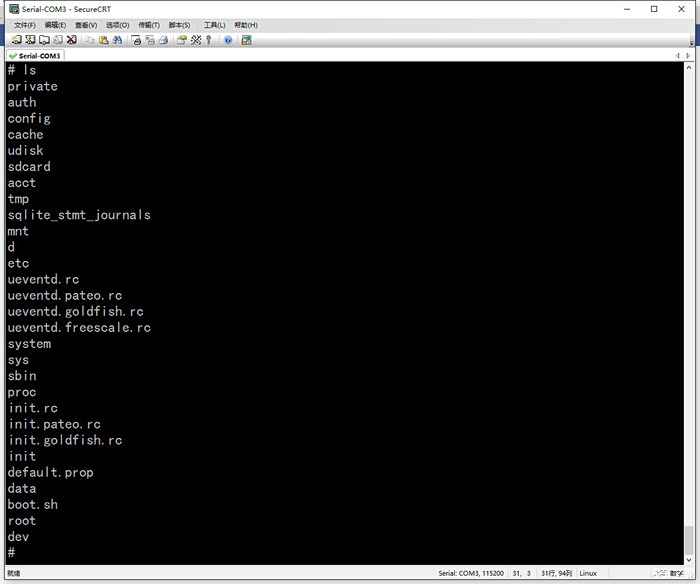 9.接通导航电源,可以看到SecureCRT软件有反应了,等待它启动完全,按回车,这时你可以看到一个#号 光标也一闪一闪,尝试打 ls 并回车,可以看到把根目录文件给列出来了,说明你完全获取了最高权限。