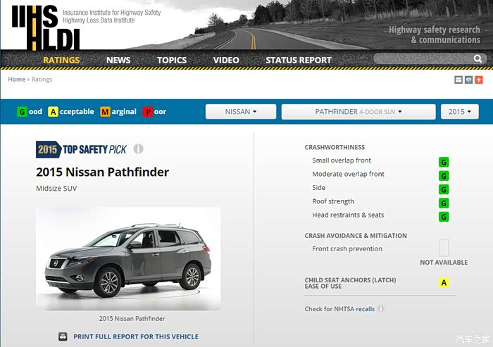 至于说日本车轻,不经撞什么的,可能是以讹传讹吧,这车的重量不轻,网上可以查到,美国的碰撞实验室IIHS得出的结论2015 PATHFINDER,小碰,中碰,侧碰,车顶强度,头部及座椅束缚都是最好的G,儿童座椅挂钩的易用性是A,可接受。