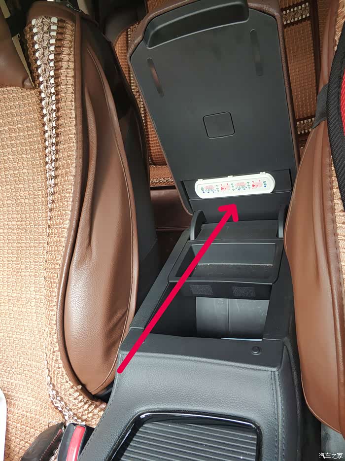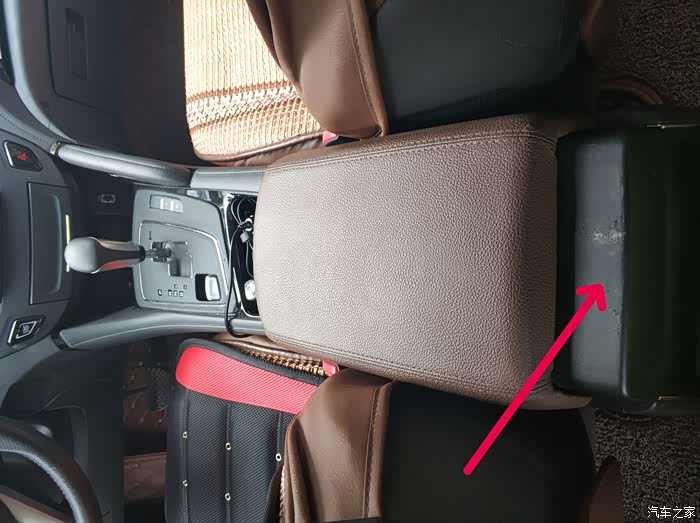 还是装中央扶手箱。用一块白色的塑料粘住。打开扶手箱,盖子就不会往下滑落。也保证了右手肘关节有地方搁置。