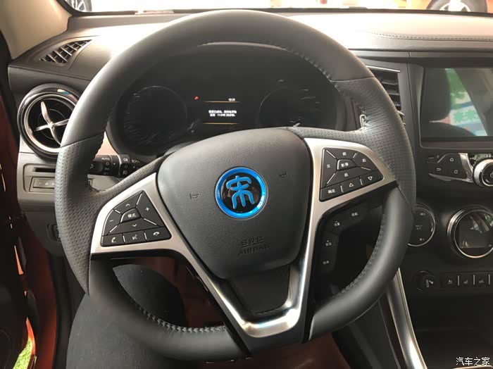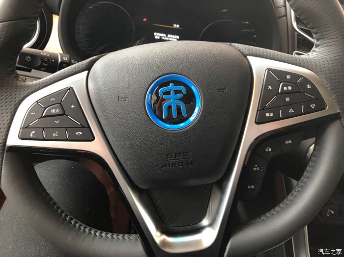 这是现在比较流行的平底三辐多功能方向盘,黑底蓝字的“宋”字也区分了燃油版的黑底红字,手感上还是比较有质感的