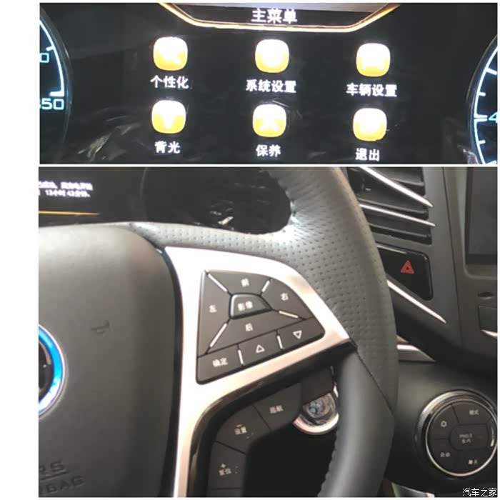 右侧主要是中控台屏的一个360度全景影像,点击影像按键后,前后左右的操作切换中控屏的影像显示。下方是仪表盘的中间多媒体的操作,通过上下三角箭头的操作切换,确定后可以进入相对的页面设置等。