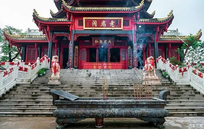 沿宫后石级而上百余米即至青城极顶,顶上建有一亭,置身亭中可观青城日出、云海及神灯等自然美景,建有老君阁,阁中供奉老子骑牛像雕塑,为青城山著名的道教宫观之一,也是青城山之旅的最后一程。