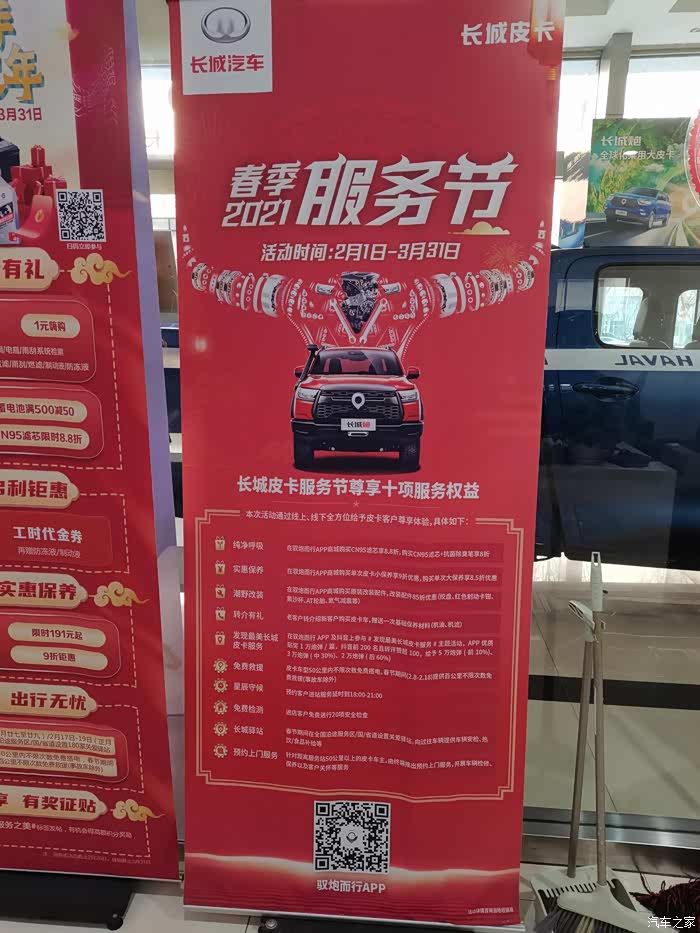 进入4S店展厅就能看见长城的春节福利活动指示牌,看着这长城炮的皮卡还是挺心动的。