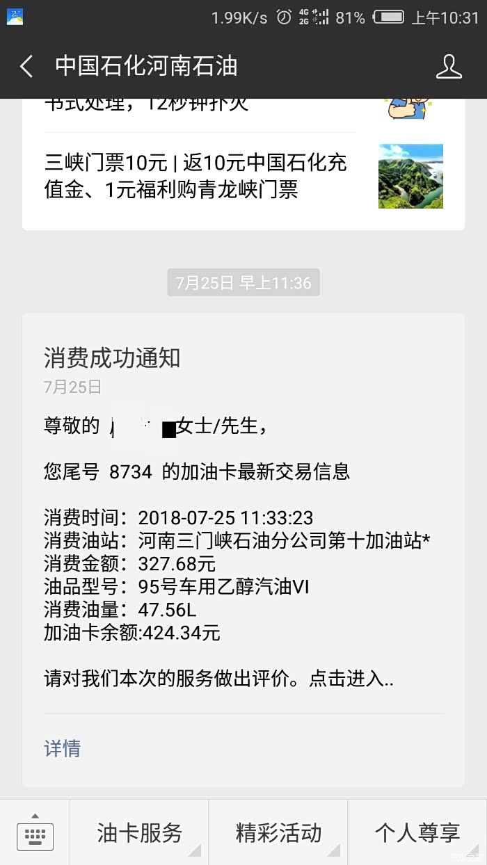 7.25号加95号油47.56升,中石化活动6.89元每升,7.31号灯亮,四百公里,百分之九十的路程开空调,油在优惠情况下每公里合8毛,百公里11.9个油。
