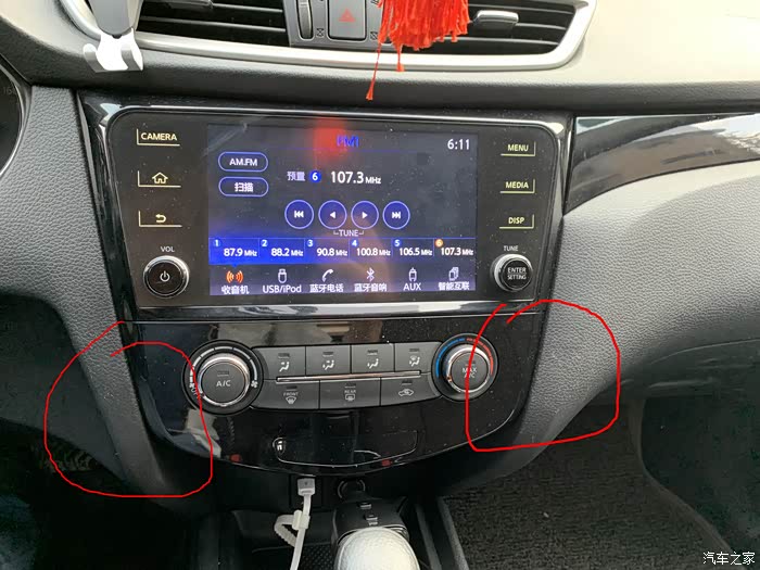 然后第2步就是拆手套箱上面装饰面板,然后就是圆圈地方,空调面板,这里很难拆,里面有4个扣子,要从下面使劲掰才可以把空调面板拆掉。