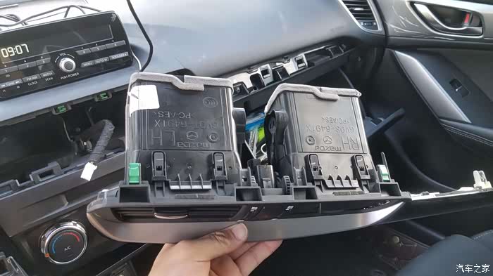 图上绿色的卡子就是固定出风口的,拆解的时候容易弄断,需要当心一点,装回去的时候先把卡子装在出风口上在把出风口装回中控
