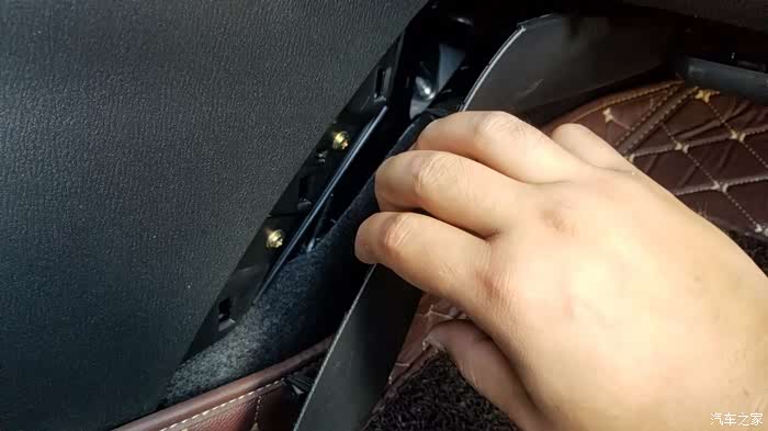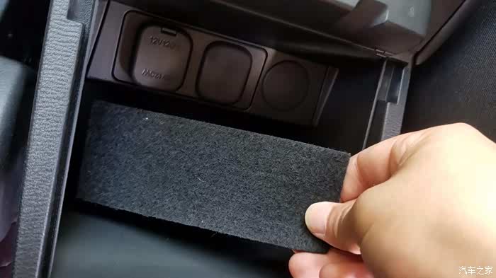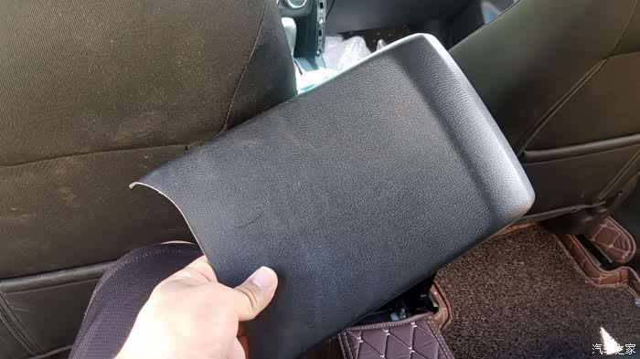 打开扶手箱,底下有一块绒布材料,拿起来就能看到2个螺丝孔