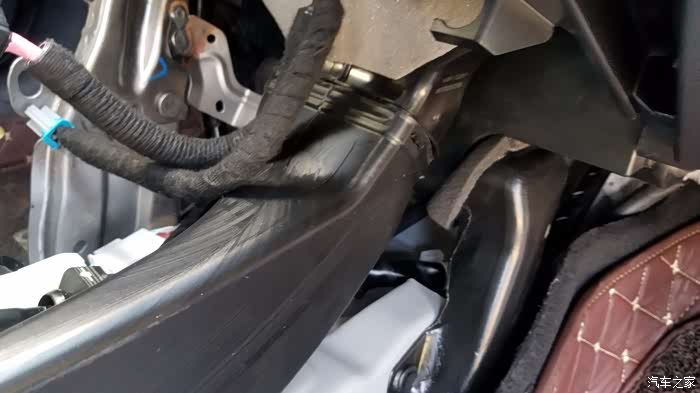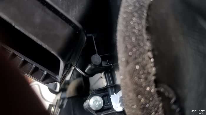 连杆安装非常麻烦,需要把头升到方向盘底下才能操作,连杆一头装在转接口上,另一头如图找到图片中米黄色的连头头,一共有三个,需要装在最上面一个上(长度正好与连杆的长度一致)完成以上步骤后,基本已经完成后排空调出风口的安装
