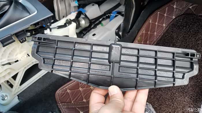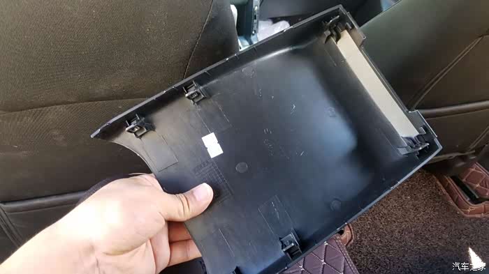 所有卡扣、螺丝拆完后,就可把整个中央扶手拆下来了,如图所示从前面开始翘,很轻松就能把中央扶手框拿下来