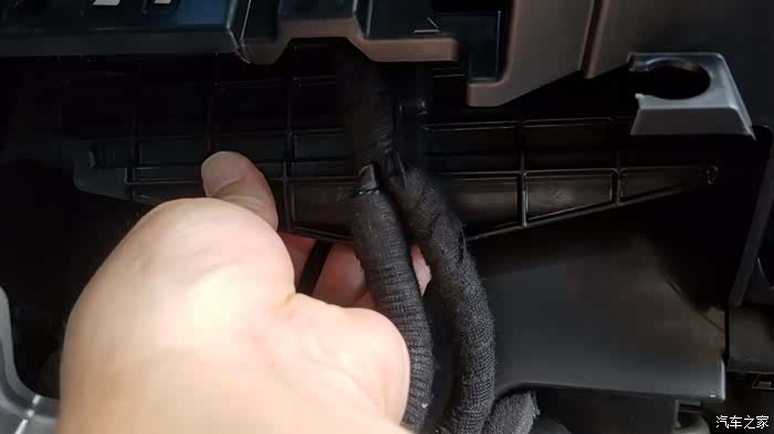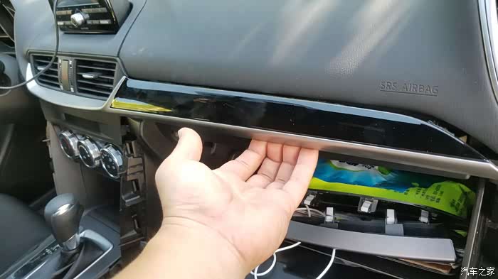 拆解第一步,打开手套箱,沿装饰条的下口拉出装饰条(注明:手套上上方装饰条稍加用力就可拔出,出风口那块需要大力拔出,同时很有可能造成卡扣断裂,所以施工的时候力度和角度很重要,要平行拔出)