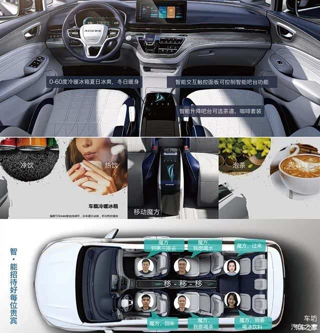 另外,该车还有一个亮点,就是搭载了一套可移动式中央扶手,官方称之为“移动魔方”,可前可后,可高可低,扶手箱中配备了车载冷暖冰箱,可通过上面的面板实现智能吧台功能,并且可以实现语音智能控制。