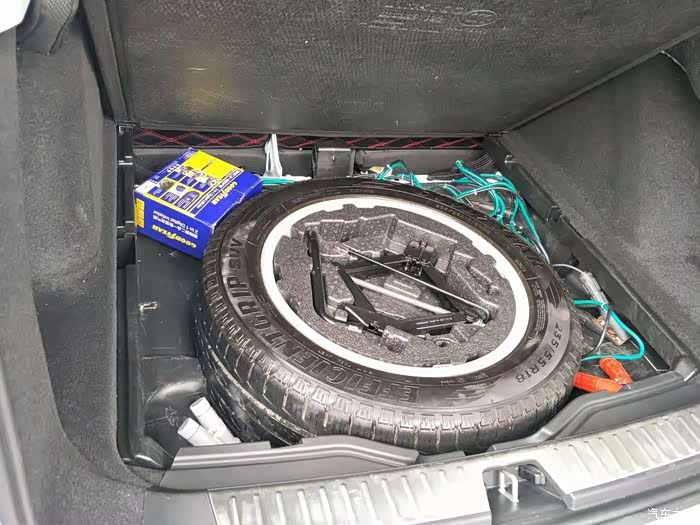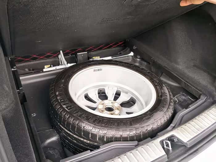 原右后轮被两次扎胎补好的轮胎作为备胎。行李箱底部原非全尺寸位置的空间偏小,轮胎需要放气才能装进去