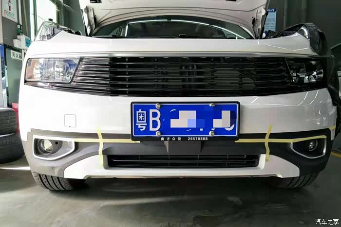 和施工的师傅共同确认前杠的位置,确保打孔后方无支撑件、远离车牌金属框及防撞钢梁。与厂家技术人员反复确认最合理的方位。