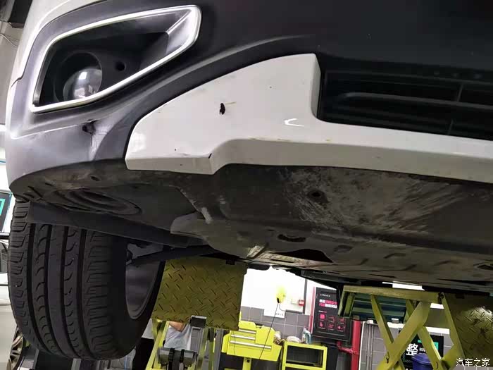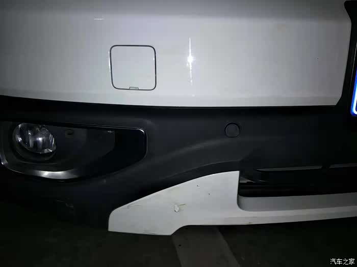 看看右前杠部位,家里领导停车接电话再走时没注意右前方的柱子。9月底去升级车机时升起底盘才发现前杠和发动机护板的卡扣也崩了。