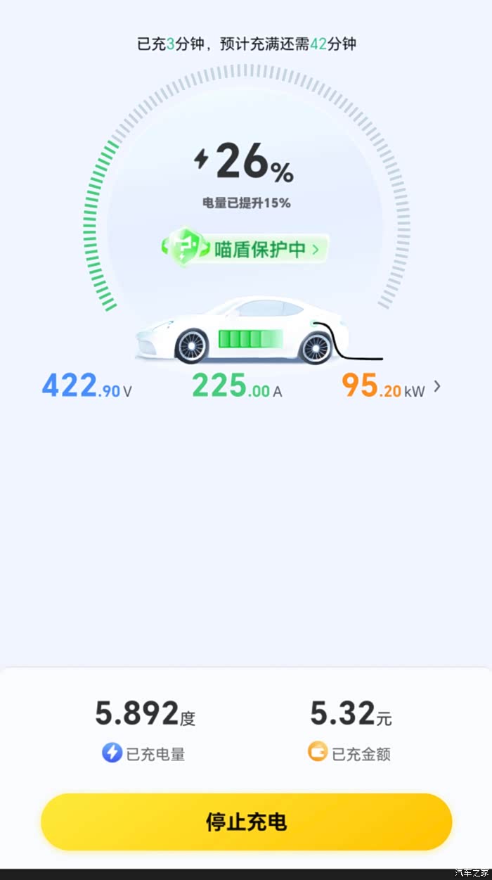我当时在低电量在充电的时候,最大功率近95kW,电流225A。一段时候可以听到车子的冷却系统在工作,为电池散热。