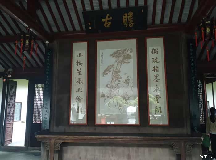 盆景掩映着一间敞厅——瞻古厅。厅前两柱楹联:“西听梵王钟,感激千秋义气;东临钵池水,洗淘一片丹心”,这是水明楼的建造主持者——徽商汪之珩亲撰并书(忘了拍)。他这笔银子花得十分风雅,青史留名了! 中堂横匾书“瞻古”二字,是清朝画家查士标的墨宝。 两侧对联:“偶耽翰墨衣云阁;小按笙歌水绘园”,则是 南通 的张圣人张謇所书。张圣人的足迹遍布 南通 , 如皋 也有啊。