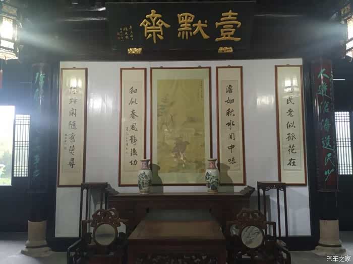 现在的“一默斋”三字由当代著名书法家顾廷龙在88岁时题写。屏风正中是《故唐解元 竹溪 高逸图》,两侧配有两副对联。