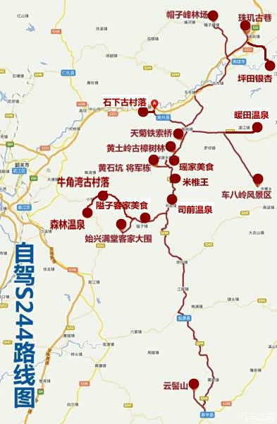 S244省道常年车流稀少,被众多驴友称为“广东最美省道”。S244全长300公里,沿线可以扩展出很多精彩的分支,其中最为精彩的路段是始兴的司前到县城,连接粤北众多美景。其中最为精彩的路段是始兴的司前到县城,沿途除了帽子峰林场、苍石寨、深渡水乡、满堂客家大围等诸多景点外,还有红叶、溪水、杉树、古樟树、银杏林、炊烟、农田等自然美景,一年四季美景不断,特别适合“洗肺不洗车”的自驾游。