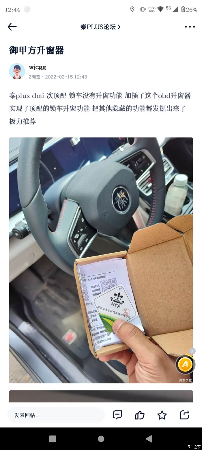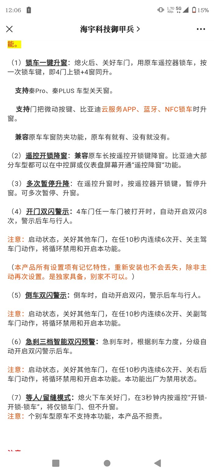 秦plus dmi 次顶配 锁车没有升窗功能 加插了这个obd升窗器 实现了顶配的锁车升窗功能 把其他隐藏的功能都发掘出来了 极力推荐