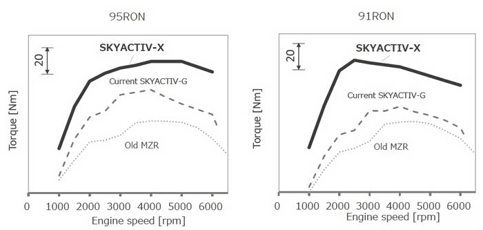 从图中可以看出来,马自达的skyactiv-G发动机加95号油时在整个转速区间的扭矩性能都有提升,在3000~4000转的扭矩提升更明显一些。