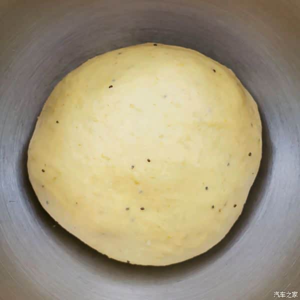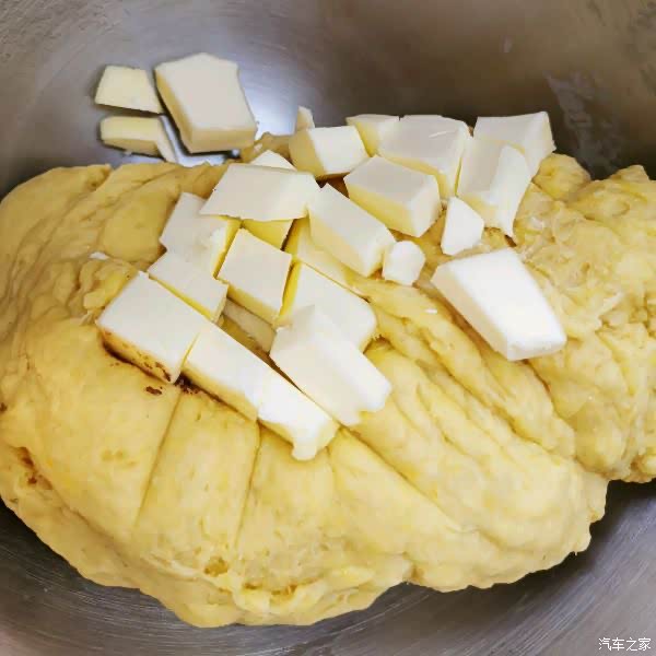 启动厨师机,将所有材料揉匀成面团,大约揉十分钟左右即可(面团很干,出不了膜),加入50g切碎的黄油,再次启动厨师机。